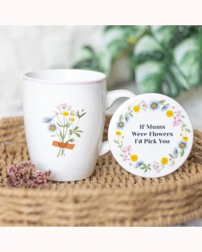 A heartwarming and blooming with love, this ceramic mug and coaster set makes the perfect Mother's Day gift. Adorned with a bouquet of spring flowers, the mug pairs beautifully with the matching coaster featuring a sweet message "If Mums Were Flowers, I'd Pick You". A charming duo for brightening Mums day with every sip. 350ml capacity. Dishwasher and microwave safe.