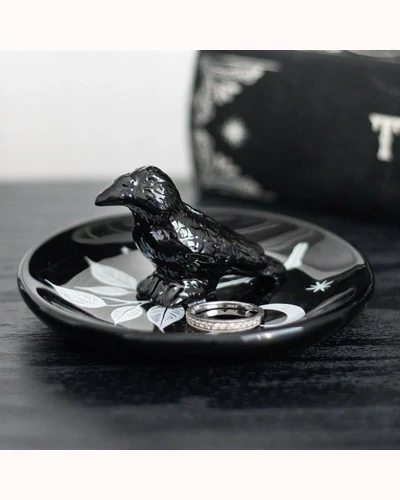 Keep your small treasures safe on this enchanting trinket dish, featuring intricate raven and moon details in bold black and white. A stylish accessory for gothic-themed bedrooms, dressing tables, or as a unique gift.