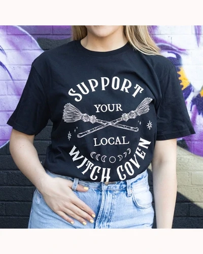 Show your support for the sisterhood with this unisex 'Support Your Local Witch Coven' t-shirt, featuring white text with broomstick and moon phase illustrations on classic black fabric. Perfect for spellcasters and lovers of witchy fashion, this top makes a magical gift or a standout piece for alternative wardrobes.100% Cotton. Unisex Fit.
