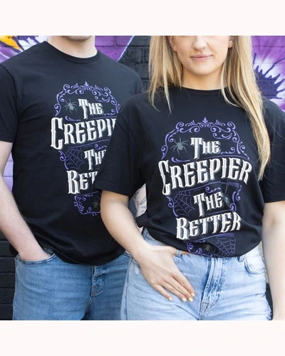Lean into the eerie with this unisex 'The Creepier the Better' t-shirt, featuring an elegant, gothic outline with spider illustrations. Perfect for anyone who loves the spooky side of life, this tee makes a fun statement for Halloween and alternative wardrobes. 100% Cotton. Unisex Fit.